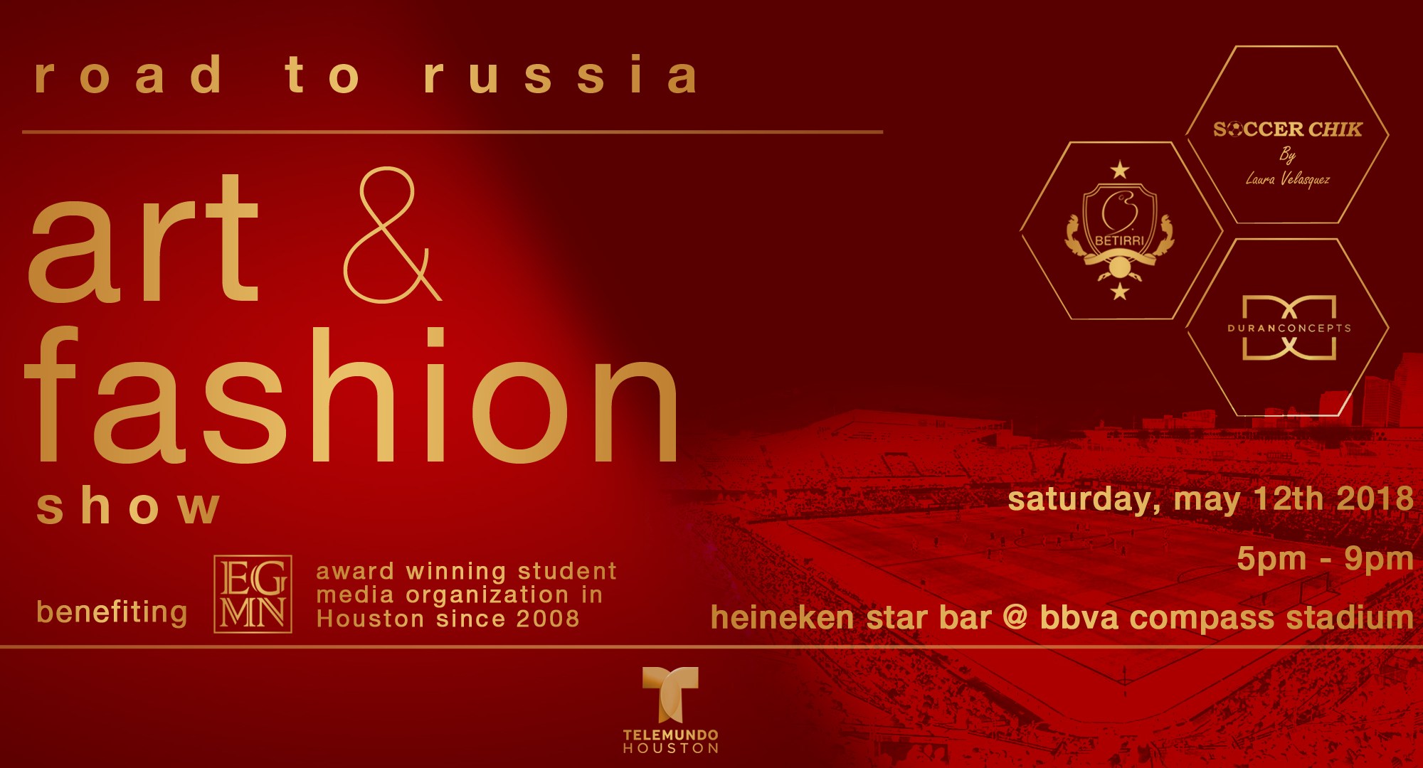 Road to Russia: art+fashion show was a success! Yesterday over 150 guests filled the Heineken Star Bar at BBVA Compass Stadium for the second installment of the Road to… event series. Visual artist Betirri exhibited selected art pieces from his collection and SoccerChick by Laura Velasquez presented the new Spring 2018 line.
